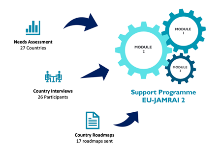 The Support Programme is a co-creation between EU-JAMRAI 2 Work Package 5 and the EU-JAMRAI 2 Policy Officers Group/Liaisons Officers. It builds on the insights gathered through the needs assessment involving 27 countries carried out during Q2-Q3 of 2024, the interviews conducted with 26 participants between June and September 2025, and the work of national roadmaps along during the whole EU-JAMRAI 2 project. These inputs highlighted the diversity of contexts, challenges, and priorities across countries, which the programme addresses through three modules: